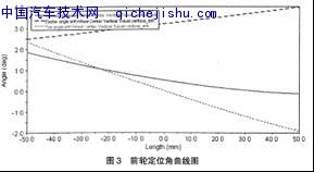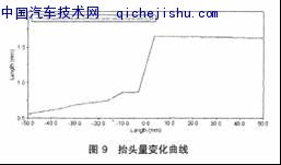 前束角:设计时希望在车轮跳动时前束角不变或变化幅度较小。前束变化的较理想特性值为:前轮上跳时,为零至负前束(-0.5/50mm),图中前轮上跳时的变化范围为0~-1.9°/50mm,不满足设计要求。