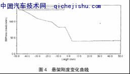 悬架刚度:图4为悬架刚度变化曲线。随着车轮的由下往上跳动,悬架刚度变化不大。