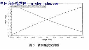 车轮跳动产生的转向角:图6为转角变化曲线,左、右车轮变化相反。在车轮跳动过程中,方向盘固定,由于转向拉杆的作用,左右车轮会产生绕主销的转动,从而使左右车轮产生转向角。一般要求将该转角控制在一定的范围内,否则不仅影响汽车的操纵稳定性,而且会加剧轮胎的磨损。图上可以看出转向角过大。