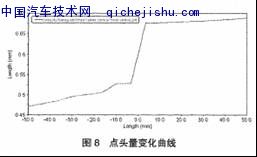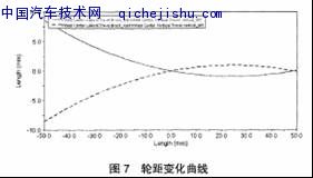 轮距变化量:图7为左右车轮轮距变化量。跳动时,车轮绕瞬时中心摆动,左右轮之间的距离必然产生变化。轮距的变化一方面影响汽车的操纵稳定性。另一方面,由于轮胎的横向滑移,导致轮胎的磨损,降低了轮胎的使用寿命。设计时应尽量控制轮距变化量,一般轿车的轮距变化应在-5mm/50mm~5mm/50mm之间,图中轮距变化量为-8mm/50mm~8mm/50mm,偏大。