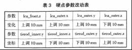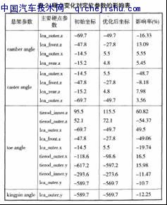 利用 style="FONT-FAMILY: 宋体; mso-ascii-font-family: 'Times New Roman'; mso-hansi-font-family: 'Times New Roman'">模块,对车轮定位参数中的某项或是多项进行优化,使定位参数达到一个理想值。对麦弗逊悬架的下摇臂前点(lcafront)、后点(lca_rear),转向拉杆内点(tierodinner)、外点(tierod outer),下摇臂球头销(Icaouter)等五个坐标点的15个坐标值(每个点有X、Y、Z三个方向坐标)进行分析,设定每个坐标值的变动范围在-l0mm~l0mm之间。对于15个坐标值Insight将进行215次迭代解算,由于计算量过大,实际上只进行了64次的部分迭代。进行完迭代解算后就可以得到相关的分析数据。表2列出了硬点变化对定位参数的影响。