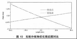 车轮外倾角优化前后对比。从图10可以看出,优化后车轮外倾角的变化范围是-0.5°~2.1°,比优化前的范围还要大一点,这是因为Insight为了兼顾其他几项定位参数的优化而放弃了外倾角部分利益的缘故。