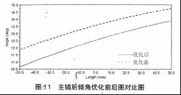 主销后倾角优化前后对比。如图11所示,主销后倾角为正值时有抑制制动时的点头作用,但太大时会使车轮支撑处反力矩过大,易造成车轮摆振或转向盘上力的变化。优化后,主销后倾角的变化范围在1.8°~2.8°之间,大大小于优化前的变化范围,而且完全满足要求2°~3°的设计要求。