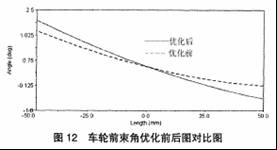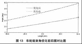 车轮前束角优化剪后对比。如图12所示,优化后,前束角的变化量比之前相比大大减小,这将对车辆直线行驶的稳定性有显著提高。