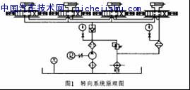 工作原理如下:当方向盘发出转向指令后,由控制器经过计算、分析,向流量控制伺服阀发出信息,控制阀的开度。同时,由液压泵向系统供油,通过流量控制伺服阀来控制各个转向油缸的流量和压力,从而控制各个转向轮的偏转角度,各个转向油缸的压力可由对应的溢流阀调定,并通过压力表显示出来。此转向系统采用并联连接,4个轮能独立转向,互不干扰。