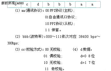 PLC采用自由通讯口方式读取条码的信息,主要用到3个寄存器SMB2、SMB3、SMB30。通讯接收字符缓冲器SMB2用于存放在自由口通讯方式下接收到的当前字符,它是一个暂存寄存器,一般应在下一步取走其中的内容。通讯校验结果寄存器SMB3,在作自由口通讯时,PLC的通讯接口按由SMB30规定的奇偶校验方式对所接受到的信号作校验。若检测到错误,PLC自动把SMB3.0置1,根据此标志位,可决定当前信息的取舍,同时还可在出错的情况下,将此错误信息发给对方,要求重发。控制字寄存器SMB30用于存储通讯方式控制字,由用户写入,属于可读写的特殊标志位寄存器,其格式如下: