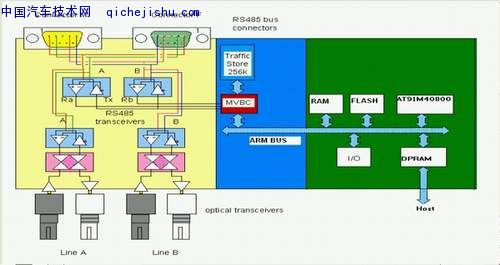 在本系统的设计中,综合以上各方面的因素,考虑到处理器性能,操作系统支持以及列车上严酷的工业环境等等,在MVB系统中选用了ATMEL用于工业控制领域的工业级的AT91系列ARM处理器AT91M40800,它是基于ARM7TDMI内核,内含高性能的32位RISC处理器、16位高集成度指令集、8KB片上SRAM、可编程外部总线接口(EBI)、3通道16位计数器/定时器、32个可编程I/O口、中断控制器、2个USART、可编程看门狗定时器、主时钟电路和DRAM时序控制电路,并配有高级节能电路;同时,可支持JTAG调试,主频可达到40MHz。
