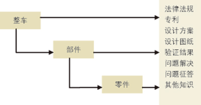 以通用汽车结构为基础,以层次形式展现汽车的基本结构。用户在此基础之上点击相关汽车结构,系统提供链接到相关零部件的参数、图纸、标准和规范等零部件的基本知识,同时系统也可从该零部件链接到与该零部件相关的常见问题、解决方案等技术资料。如当工程师从树形或层次结构列表中指定发动机后,知识库中存放的各类发动机的型号、参数和使用场合等基本信息以及各种发动机在过去车型中的使用情况等资料均可被检索出来。