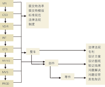 图3描述了SGMW-TDC知识库管理系统按流程检索的基本流程。首先,系统给出VDP的基本流程,当工程师选中流程中某一具体环节时,系统提供与该环节相关的法律、法规、检验标准及工作模版的查询,并可在此基础上进一步深入到该阶段中与具体车型、具体零部件相关的知识的检索。