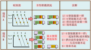 从图2来看,情况A由于做到集货的平准化,因此车辆没有出现装载溢出的情况,并且更合理地利用货车的空间,利于成本的节省。同时,由于3个供应商每次出货的货量基本是一致的(前面已经说明),因此供应商的作业可以做到平准化,并可以使供应商存放零部件的面积达到最小化。以SUP C为例,在情况A时,如果一天集货4次,供应商只需要一天货量的1/4的空间就足够了,即假如给供应商一天要提供40m3的零部件,它只需有10m3的存储空间就足够了。而在情况B下,供应商就需要准备可以存放一天货量的空间存放零部件,即要准备40m3的空间,这样无疑降低了供应商空间的利用率,增加了成本。