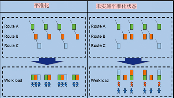 平准化是实现JIT的前提条件,其含义是将生产或供给的物品种类和数量进行平均化。在生产和供给的过程中,实现平准化可避免工序完成品不足或为防止缺品而准备库存,避免人员、器材以浮动的最大值做准备,同时可消除不必要的浪费。在丰田的物流体系中,平准化得到了广泛应用。