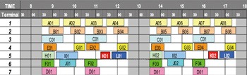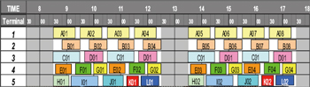 图4-1和图4-2是平准化操作和非平准化操作的两个例子,A01~A08表示A线路一天卸货8次,并在1号卸货口装卸零部件。图4-1中从A线路到L线路,卸货时间平准化时,只需要5个卸货口就足够了,而图4-2中卸货时间虽然平准化,但是没有做到零部件受入的平准化,因此在卸货次数相同的情况下,图4-2需要7个卸货口。在人员数量上,图4-1只需要5个操作人员操作(每个卸货口一个人操作);而图4-2的情况则需要3~7人不等,早上8:30要7人操作,而9:30~10:00左右,只需要3人操作。图4-2的情况造成了人员的浪费和成本的上升。图4-1中每条线路的受入时间是平准化分配(装卸货的间隔相等)。这样受入口的利用率和人员的利用率最高,成本可得到有效控制。