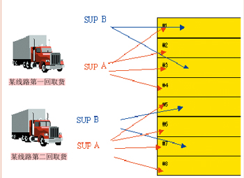 假设工厂的订单分割是8,则进度吸收链的链数也有8条,某取货线路有A和B两个供应商,它们均一天集货2次。其中供应商A根据货量确定订单数是8个,而供应商B根据货量确定订单数是4。每次集货供应商A会出4个订单的零部件,分别是订单1~4和订单5~8。供应商B每次会出2个订单的零部件,分别是订单1~2和订单3~4。第一辆车卸货后,操作人员把供应商A的前4个订单分别放到进度吸收链的第1至第4条链,把供应商B的前2个订单放进进度吸收链的第1和第3条链。在第二辆车卸货后,操作人员把供应商A的后4个订单分别放到进度吸收链的第5至第8条链,把供应商B的后2个订单放进进度吸收链的第5和第7条链。这样做的目的是尽量保持P-LANE的平准化。在进行进度吸收链平准化操作的时候我们通常会遇到供应商B的情况,链数比订单数多,即进度吸收链的链数是8,但实际上供应商的订单数只有4,我们就会把这4个订单放在第1、3、5、7链或2、4、6、8链,而不会把这4个订单放在1、2、3、4链。根据上面的例子,SUP B的4个订单放在1、3、5和7链后,2、4、6和8链的货量就会比较少。实际上,零部件的供应商有100多个,因此一天4个订单供应商也有不少,即会有SUP C一天4个订单,这时我们会把SUP C的4个订单放在2、4、6和8链,这样就能保持进度吸收链的货量平准化。
