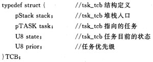 任务控制块由任务堆栈、任务入口地址、任务状态字和任务优先级4个部分组成。任务堆栈用于保护被中断的现场数据;任务入口地址是指向任务程序的指针,用于指定任务所进行的操作;任务状态字用来表示任务当前的状态和延迟的时间间隔;任务优先级表示就绪列表中的哪个任务可以优先进入运行状态。