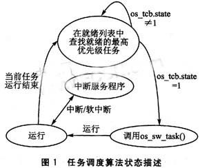 在实时操作系统中,系统把应用分为行为可以预知的、功能确定的多个任务。每个任务一般处于3种状态;执行状态、就绪状态和等待状态(有的操作系统还具有挂起和休眠状态)。为了满足实时性要求,系统根据一定的原则选择合适的任务执行。