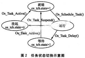 ③任务状态转换主要是激活任务os_Task_Active()、挂起任务os_Task_Suspend()和延迟任务os_Task_Delay()。挂起任务使任务进入挂起状态,延迟任务使任务进入等待状态,而激活任务函数可以使任务从挂起状态或者等待状态直接进入就绪状态。任务的状态由任务控制块中的任务状态字(os_tcb.state)给出。当os_tcb.state=1时表示任务进入就绪状态;当os_tcb.state=0时表示任务处于挂起状态;当os_tcb.state>1时表示任务等待os_tcb.state-1个系统时钟间隔之后进入就绪状态。任务状态切换示意图如图2所示。
