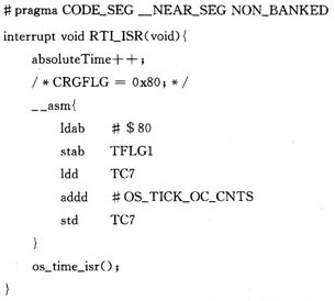 #pragma CODE_SEG DEFAULT在MC9S12DP256B的捕获器中有一个自动增长主时钟,每一个硬件周期驱动TCNT十1,并与TC7相比较。设置TC7=TCNT+OS_TICK_OC_CNTS(在系统配置文件中定义),当度过OS_TICK_OC_CNTS个硬件周期时,TCNT=TC7则产生中断。在中断中调用系统时钟节拍函数提供精确的系统时钟节拍,并再次初始化TC7=TCNT+OS_TICK_OC_CNTS,产生下一个时钟节拍。