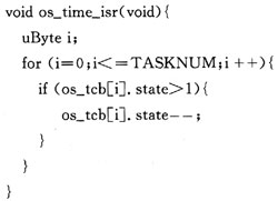 ①从任务控制块列表头部开始顺序检查各任务状态字,将所有延迟任务的任务状态字减1。