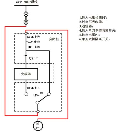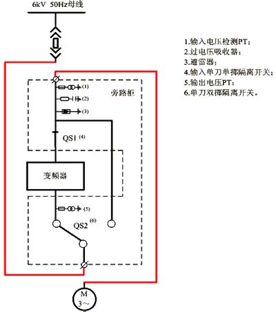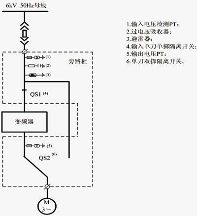 按照目前国类普遍采用的变频器调速系统一次回路形式,变频器的正常运行分为工频旁路运行和变频运行两种情况,其接线主回路图如图6和图7所示。
