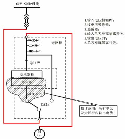 该案例发生在我公司为某家企业转炉风机配置的高压变频调速装置上,由于需要更换电缆,维修人员在更换时将输入电缆错接在变频装置输出位置上,从而引发了严重的事故,在合高压的一瞬间变频调速装置的功率单元全部损坏,造成了严重的经济损失。