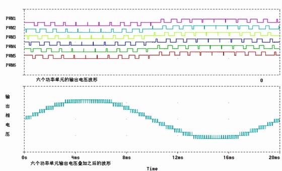 每个单元输出PWM波,将每相N功率单元的输出电压叠加,产生多重化的相电压波形,使相电压产生出2N+1个电压台阶,六个功率单元输出的PWM波形及叠加之后的相电压波形如图4所示。
