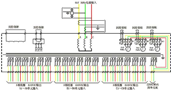 移相变压器电气原理如图5所示: 变压器(以输入6kV变压器为例)原边绕组为6kV, 副边共十八个绕组分为三相。每个绕组为延边三角形接法,分别有±5o 、±15o 、±250等移相角度,每个绕组接一个功率单元。这种移相接法可以有效地消除35次以下的谐波。因此,采用移相变压器进行隔离降压,不会对电网造成超过国家标准的谐波干扰。
