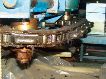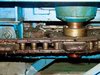 驱动链部是将减速机输出的功率通过驱动链传递给输送链,使其运行。在此部位有调整螺栓,可以通过调整螺栓来调节驱动链的松紧,从而使输送链运行得更平稳。它是驱动和输送的连接部件。
