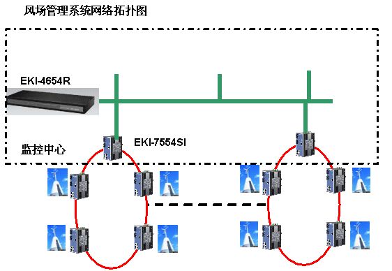 每个风机的塔基处安装一台研华的管理型冗余交换机EKI-7554SI,通过单模光纤连接构成一个冗余环网。同时监控中心内部每个环网的EKI-7554SI通过电口连接到研华24口网管型冗余千兆以太网交换机EKI-4654R。监控中心内部服务器,工程师站通过EKI-4654R构成局域网系统。
