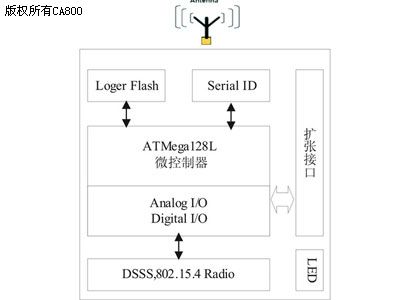 典型的终端节点和汇聚节点设计如图4所示,采用Atmel的8位RISC结构低功耗ATMegal1281VMCU作为系统控制核心。采用512KB的AT45DB041D作为外部程序存储器。射频模块使用Atmel的支持ZigBee协议的AT86RF230,RF功率达到3dBm,室外传输距离可达300米以上节点的扩展接口可连接模拟输入、数字I/O、I2C、SPI和UART接口,这些扩展接口使其易于与传感器及其它外设连接,例如外接光度、温温度、气压、声、地磁和加速度等传感器。