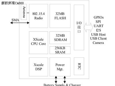 在设计无线传感器网络网关时,需要较强的数据处理能力,用以实现复杂路由协议以及信息处理等。如图5所示Crossbow的imote2节点采用了MarvellPXA271高性能、低功耗处理器。该处理器使用动态电压调节技术,频率范围13MHz~416MHz,可工作于低电压(0.85V)低频率(13MHz)模式,具备了优良的动态电源管理技术。此外,该处理器封装内集成三个芯片256KBSRAM,32MBFLASH以及32MBSDRAM,减小了体积。通过提供多种I/O,能够灵活的支持不同种类的传感器。该处理器还支持一个MMX协处理器,提高多媒体处理能力,可以用于无线多媒体传感器网络中的语音和图像处理。Imote2使用TI的CC2420ZigBee射频芯片,支持2.4GHz、16通道250kb/s数据传输,发送功率-24~0dBm。有效通讯距离是30米,可以通过SMA接口外接天线来增加传输距离。