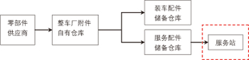 当前国内大部分整车厂家的零部件采购业务主要可分为两个部分:一部分是用于装配车辆时使用的装车配件;另一部分是用于车辆售后维修使用的维修配件(服务配件)。装车件通常是以零部件供应商(尤其是外埠零部件供应商)在整车厂附近建库建储,按照整车厂的需求订单按时按量送货。整车厂往往采取“零库存”储备或少量的风险库存储备形式。而服务配件同样是由供应商在整车厂附近的仓库供货,整车厂往往采取适量建储的形式,根据服务站的配件订单,将所需的服务配件送达全国范围内的服务站。零部件采购形式见图1。
