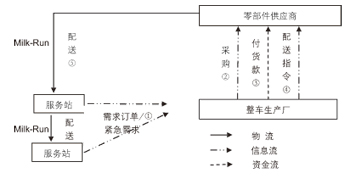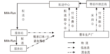 然而这看似相同的两种零部件采购伴随的物流却是不尽相同的。装车配件的最终环节是在总装车间,配送至此装车件的物流环节就结束了。但服务配件配送至配件仓库后,只是做一段时间的仓储,而后再配送至全国范围的服务站,多了一次物流作业环节。这多出的一次物流环节才是实现最终目的的作业环节。可以说,同一供应商出售给同一整车企业的同种配件,由于它们使用用途的不同,将可能采取不同的物流运作方式。例如东风汽车有限公司东风商用车公司在其零部件采购中,其中一部分配件来自于江浙地区的零部件供应商,尤以上海弗列加的三滤产品采购量最大。