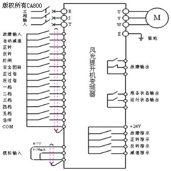 ¨ 风光提升机变频器提供完善的输入输出接口电路,内设PLC,既可以与新装系统实现配套使用,也可以对老系统进行改造,可以接受DC 0-5V、DC 0-10V 和4-20mA工业标准信号。用于系统改造时,增加远控装置,就可以实现工频与变频的相互转换,监视系统的操作和运行状况等功能。接口电路如图1示。