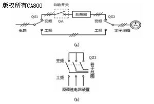 改造提升机用变频器是在原提升机电控系统的基础上,用变频调速系统替代原工频调速系统,同时保留工频调速系统,使两套系统互为备用,增加系统运行的可靠性。改造时需要增加工、变频转换功能。系统运行前,将主回路和控制回路各转换开关切换至相应的变频或工频位置。具体接法如下: