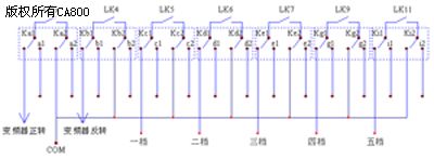 变频器远控装置用做工、变频控制回路的切换装置。远控装置内用七个双刀双掷开关作为正、反转和五段速的切换部件,其原理如图4所示。