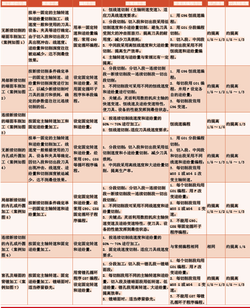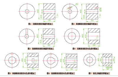 东风柳州汽车有限公司经过近15年应用数控机床的实践与探索,逐步摆脱传统加工工艺和加工编程编制方法的约束,找到一种有效提高生产效率、降低加工成本的方法。根据各种不同类型的零件,按加工部位的形状进行分类,可分成如表所列的典型类型,在零件的加工过程中,在设备、刀具和夹具已确定的前提下,线速度、进给量和切削深度是影响生产效率、刀具耐用度、表面粗造度及尺寸精度的主要变量,因此,灵活地运用非常规的加工工艺和编程方法解决好它们之间的关系,可提高生产效率,降低加工成本,为直观阅读现列表进行介绍。