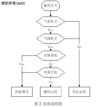 印刷机整体的电气设计对时间的要求严格,在机器的很多地方装有接近开关,用来检测不同的时间点。在印刷过程中,走纸的好坏是影响机器质量的一个重要环节。所谓纸走的好坏,指的是无歪张,双张等现象,如果有歪张,双张现象,在高速情况下,就会将走坏的纸,卷入机器内,从而破坏胶皮,给用户带来很大损失。给纸过程的流程,如图2所示:
