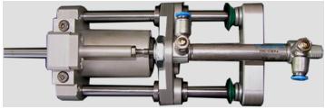 现今国内外类似的旋转压紧装置都是通过摆臂周向的旋转和轴向的位移来压紧零件,但在实际使用过程中往往会出现精度不高,强度不够,装置运动不同步及价格昂贵等缺陷。泛华测控的旋转压紧机构则完全克服了同类产品的不足。其通过一个气缸的带动,在完成直线运动的同时完成旋转运动,实现了对零件压紧的同步性。