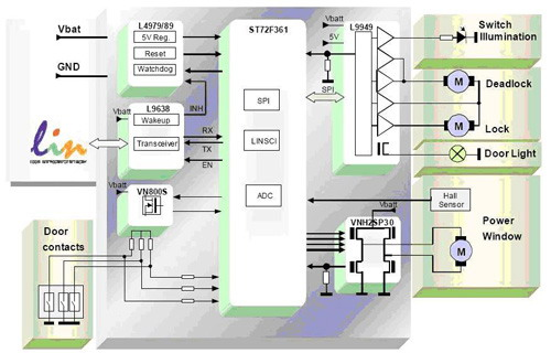 汽车门控系统的应用场景对LIN网络提出了以下需求:当主控器收到从遥控钥匙发出的有效信号时,必须要启动门控系统,从节点通常通过CAN总线接收;当正确的钥匙打开前门时,也同时启动门控系统;从节点会直接反应而不需经由与主控器的通讯;切换面板的询问动作(Polling)功能,以确保响应对各个驱动装置控制,如动力车窗、后视镜调整、门锁等的主动式切换;对所有从节点的询问功能,以得到车窗升降的位置状态,以及车门的开关情况;以及系统对所有从节点的睡眠模式控制(即电池供应操作模式)等。因此门控系统的MCU也需要与上述功能相符,例如必须针对车窗的升降提供防夹(Anti-Pinch)功能、马达的PWM控制及车窗位置监控;能以SPI接口来控制门锁马达;对于车钥匙的拔出及开门的动作,能够提供电源供应模式的接触式监控,以及对后视镜及切换面板的操控功能等。