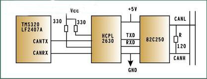 数控系统上位机采用研华公司PCL-841卡实现CAN总线通讯,伺服驱动系统采用TI公司TMS320LF2407A片内CAN控制器[3>。该控制器全面兼容CAN2.0B协议,具有标准和扩展标识符,有数据帧和远程帧,2407A片内CAN总线控制器与CAN物理总线接口采用82C250驱动器芯片。82C250采用阻抗为120Ω双绞线作通讯介质,信号采用差动接收和发送模式,抗干扰能力强,最高通讯速率可达1Mbps。有三种不同工作方式:高速、斜率控制和待机。本系统采用斜率控制,以降低射频干扰。为了增加抗干扰能力,保护CAN控制器,在TMS320LF2407A与82C250之间加高速光电隔离器,光电隔离器采用HP公司HCPL-2630芯片,速度为10MHz,电路如图2所示。