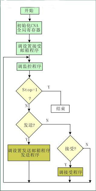 程序框图如图3所示,实验程序使用邮箱2接收,邮箱3发送。通讯软件可以采用查询方式或中断方式,主要包括CAN控制器初始化程序、接收邮箱与发送邮箱设置、发送程序、接收程序。
