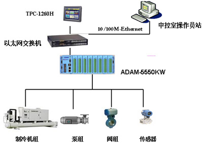 经过对需求的仔细研究,为了保证系统运行的可靠性、安全性,本系统采用两层架构:上位机客户决定选用研华自动化的TPC-1261H触摸式工业电脑,下位机采用研华自动化的可编程自动化控制器ADAM-5550KW,实现了制冷机组的自动开停、两组设备可同时运行也可互为备用,轮换工作,故障自动切换、自诊断,并提供了信号远传,方便远程控制。