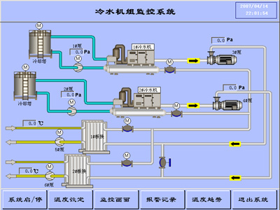 上位机软件采用的是“三维力控”的组态软件为开发平台,包含动态显示、报警、控件、趋势、网络通讯等组件,只需编写少量的代码即可生成高质量的控制系统。整套系统建设有实时监控画面,包括主监控画面、系统启停、温度设定、报警记录、趋势图。其通过颜色的变化来表明设备运行状态,状态分:无备妥、备妥、运行、报警四种,相应的颜色为:白、黄、绿、红色闪烁。机组启停分连锁、解锁两种状态。在设备运行方式为解锁时,用鼠标点击画面上相应设备,便弹出启停对话框,点击电机启动按钮可启动现场设备。传感器的瞬时值依据实际安装位置被分别标注到不同的分布工艺流程图中,其历史数据被保存到相应的历史数据库中,在趋势图中可检索查询。整个软件界面简洁直观,查阅、操作简便。