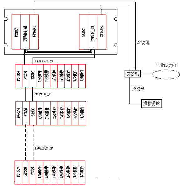 ET-200作为从站连接到Profibus-DP,适用于冗余系统。每个ET200后面带有所需的数字量I/O模块和模拟量I/O模块。接收来看现场的信号,通过Profibus-DP总线连接到CPU,供CPU处理。