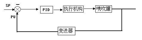 为了保证喷吹量的稳定,需保持喷吹罐内压力的稳定,通过调节补压调节阀的开度可保持罐压在设定范围之内。补压设定值与罐压实测值比较运算后,通过罐压调节画面设定输出补压调节阀的开度。功能框图见图2。