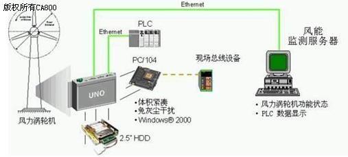 一、风电行业背景 随着国家对风电行业的扶持力度加大,风电产业发展迅猛。2007年中国大陆新增风电机组3155台,装机容量330.4万KW。与2006年当年新增装机133.7万KW相比,2007年当年新增装机增长率为147.1% 2007年中国大陆累积风电机组6469台,装机容量590.6WKW,风电场158个。分布在21个省市。于2006年累计装机259.9KW相比。2007年累计装机增长率为127.2%,提前3年实现国家《可再生能源法中长期发展规划》中提出的目标。 随着中国风电市场的快速增长以及风电机组制造商新秀的进入,中国风电机组供应市场的竞争格局也正在悄然发生变化。风电场开发商投资建设风电场的热情也空前高涨,中国风电装机容量将在2008年底再次超过人们预想而创下新的纪录!预计到2008年底,中国风电机组新增装机容量将达到730.4万千瓦,累计装机容量将达到1335.6万千瓦,新增装机容量增长率预计将达到111.71%。 国家制定的2020年风电装机3000万千万的目标,有望在2011年实现。到2020年,中国风电装机保守估计将达到8000万千瓦。 随着风力发电场的大量建设,风场信息化管理系统,风机远程监控系统业也大量应用。在这样的系统中需要可以对现场的运行设备进行监视和控制,以实现数据采集、设备控制、测量、参数调节以及各类信号报警等各项功能。各种采集信号及控制信号通过工业以太网和现场总线汇集到研华严苛计算机UNO-2170中,然后再通过另外一个以太网口将数据传送到风能检测服务器当中。在这个过程中UNO-2170充当数据网关的作用。 二、风电客户对嵌入式工控机的需求 风力发电系统通常安装在带 有灰尘和大风的恶劣环境中。在这样的环境中,使用一台有风扇的PC为主机平台将会导致风扇和系统故障。客户需要一套可靠的计算机平台,不仅平均无故障时间长,而且要求是一套紧凑的平台。经过考察客户选用了 UNO-2170做为风电控制器的数据网关。 三、 系统网络架构图