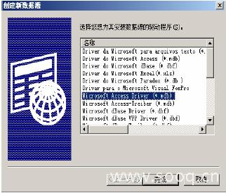 (图5)的驱动程序列表中选择“Microsoft Access Driver(*.mdb)”,并单击“完成”按钮,在随后出现的对话框(图6)中的“数据源名(N)”一栏中创建DSN 的名称,并单击“选择”按钮选择需要访问的数据库,按“确定”按钮结束。