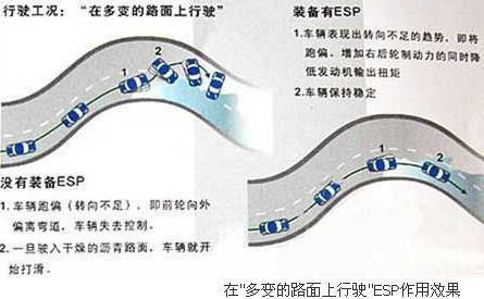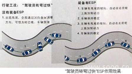 ESP是英文Electronic Stability Program的缩写,是能有效避免车辆侧滑的电子稳定程序。电子稳定程序(ESP)是一项主动安全系统,它包含有了ABS和TCS,因此它能有效防止车轮在制动时抱死(ABS),在启动时打滑(TCS)。ESP系统按照每秒25次的频率检测驾驶员意图和车辆的实际行驶情况。如果发现有紧急情况,它迅速反应,通过液压调节器,调节每个车轮上的制动压力,如有可能,还会干预发动机和传动系统,防止车辆侧滑,从而降低事故发生率。