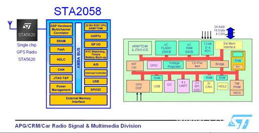如果把射频及基带分离,设计的难度会增大,但灵活性也会提高。基带模块还可嵌入Flash内存并支持较丰富的总线接口。ST的STA2058即采用这种架构,非常适用于车辆应用。其整合了32位MCU(ARM7TDMI)和嵌入式闪存模块,支持RTCA-SC159/WAAS/EGNOS等GPS系统。STA2058EX还广泛支持CAN、SPI、UART、I2C、USB等接口,拥有外接内存接口,可以用作远程信息处理服务平台,允许免黏结逻辑(Glueless)而与外部装置(如:GSM/GPRS模块、芯片卡、音频功能DSP)相连。