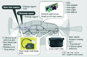由于毫米波雷达产生的电波能够穿透人体,从而给健康造成不良影响,因此毫米波雷达在能够检测的障碍物方面存在局限性,比如不能将行人作为障物来检测等,只能借助于摄像技术。在这方面,NEC抢占日本市场半壁江山的“预防撞安全”系统市场,该公司利用车载图像识别并行处理器,通过采用结合毫米波雷达及摄像头等多个传感器的信息进行综合处理的方式,检测包括前方车辆及行人在内的立体物体的距离和速度,向驾驶员发出警报,从而减轻冲撞造成的伤害。因此,代表了环境识别技术的发展方向之一。图3为基于毫米波雷达和图像传感器的环境识别技术在汽车中的应用的示意图。